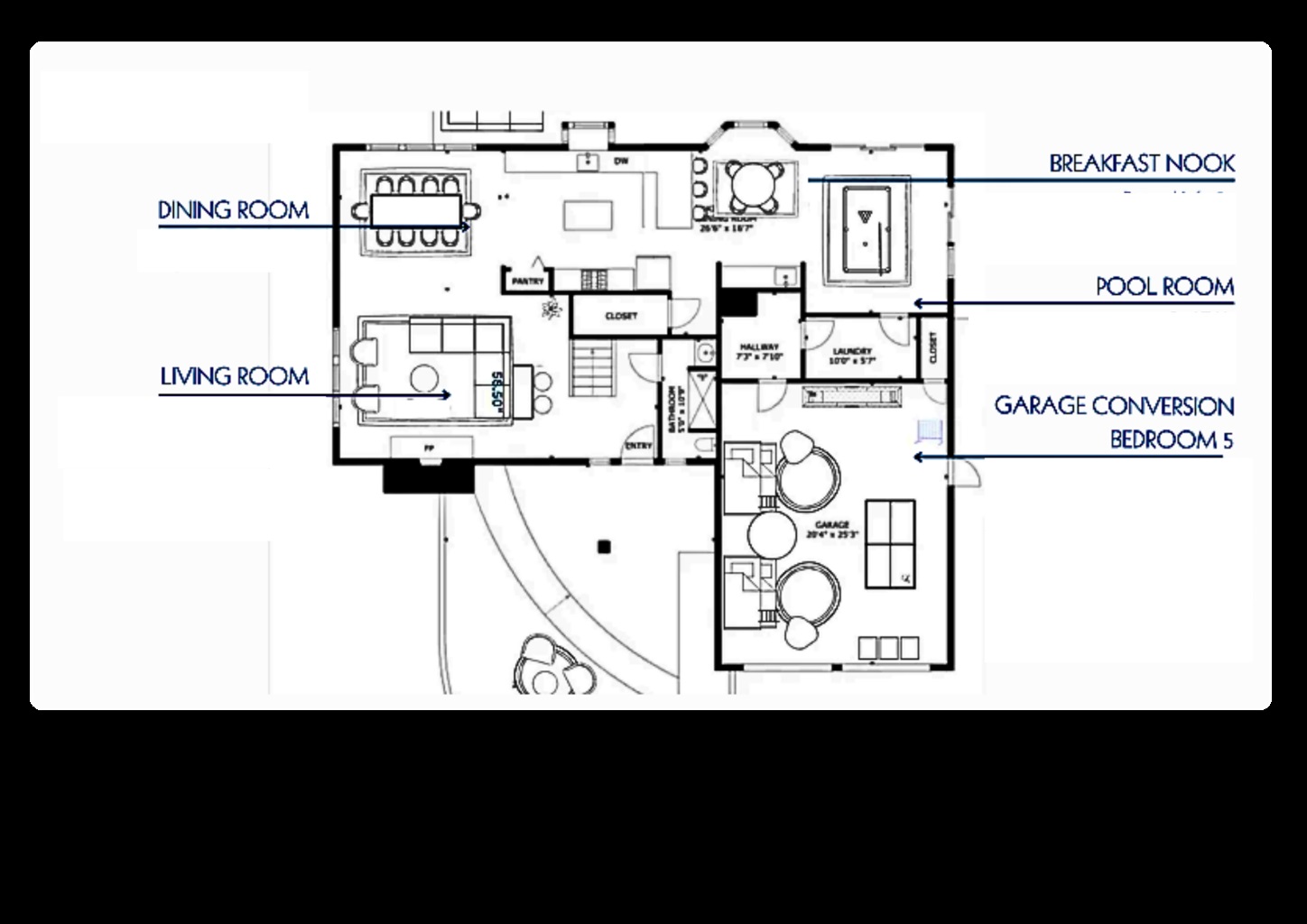 ✦ Garage-converted game + bunk room